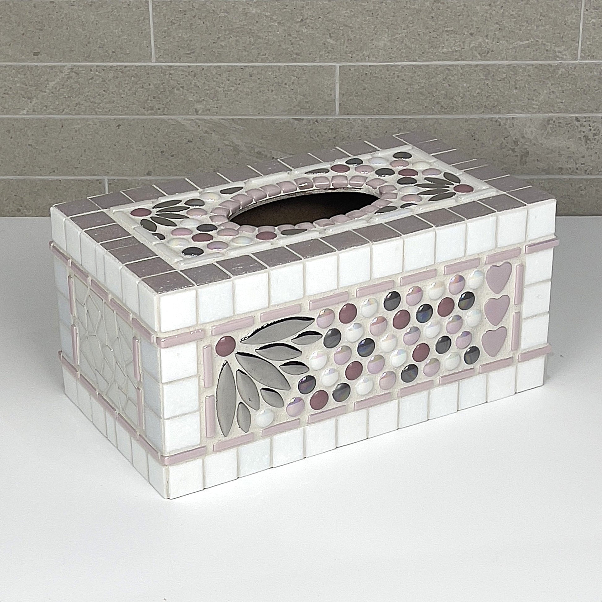 - Delicate light pink iridised square tiles at the mouth of the tissue box