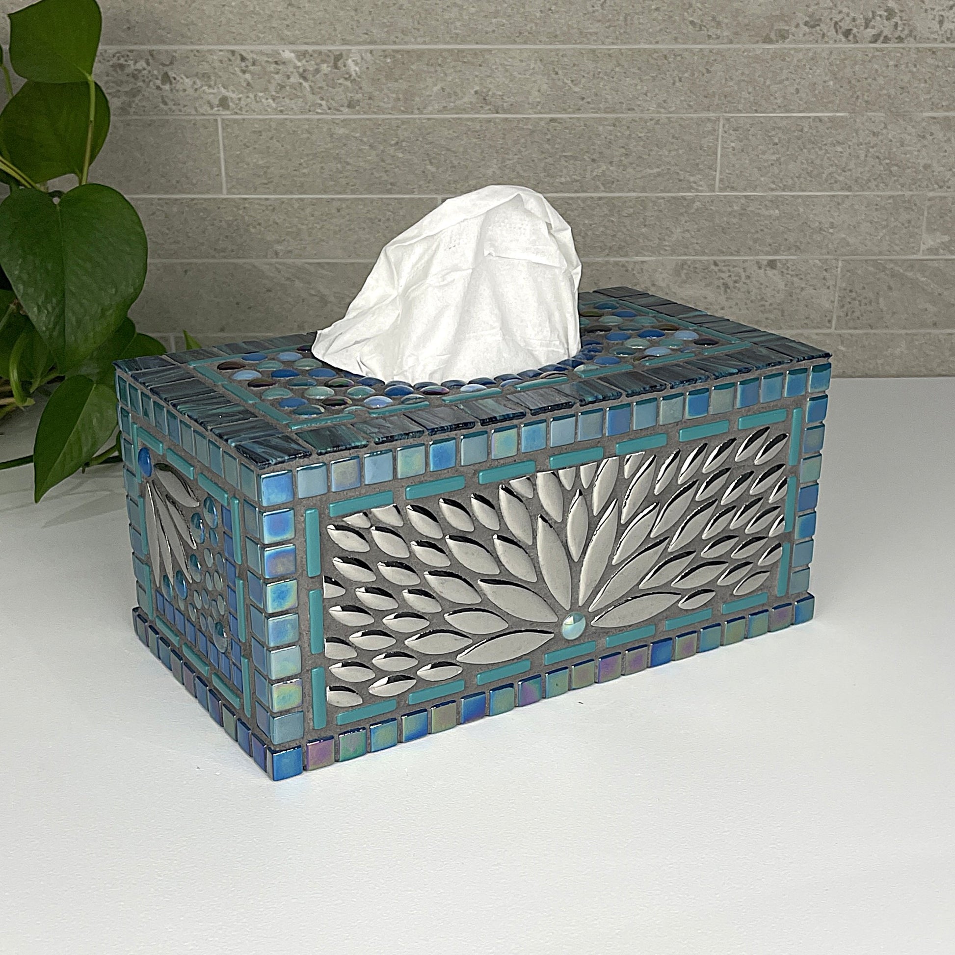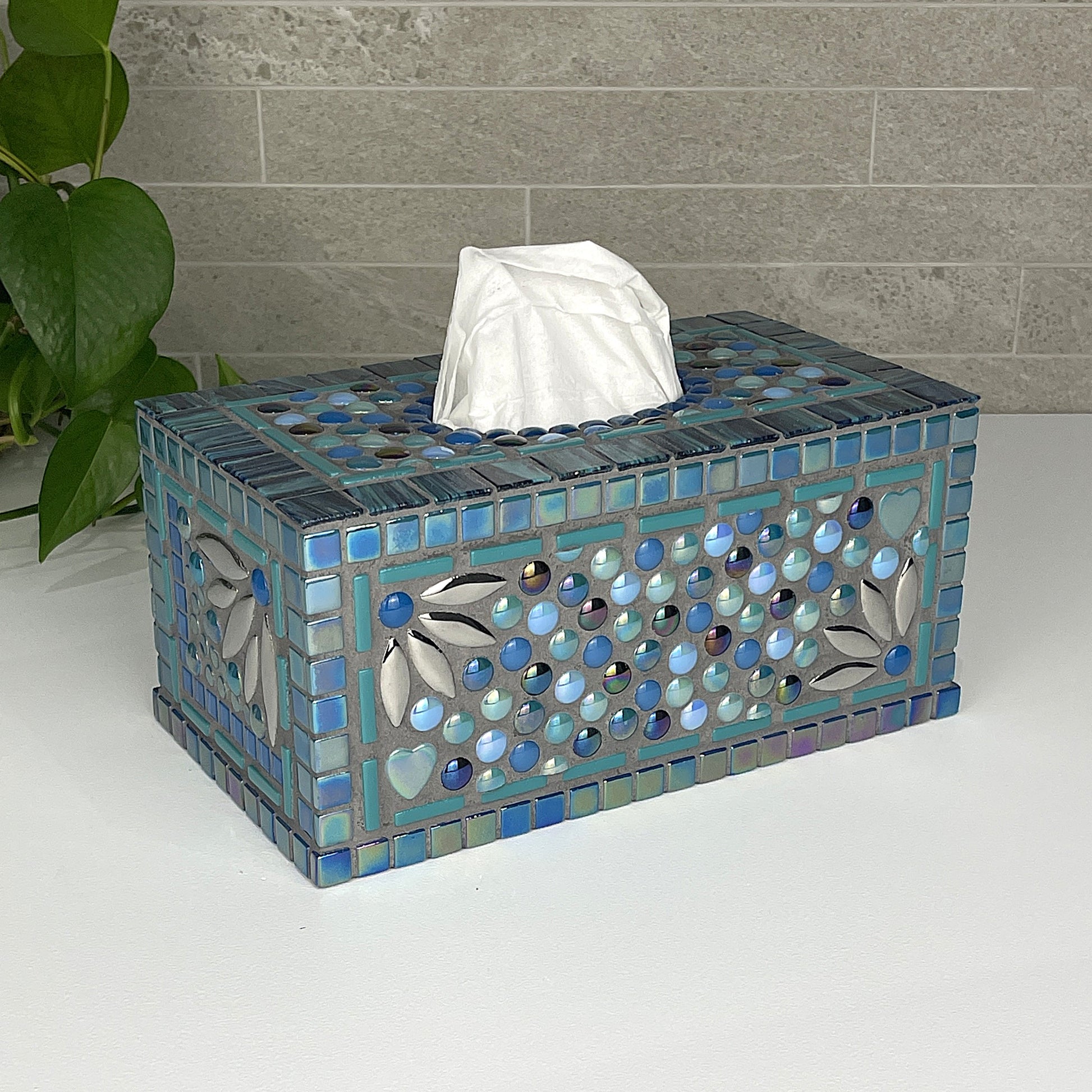 - Deep blue squares at the mouth of the tissue box with balanced teal sticks and an array of blue, teal a black circular glass tiles