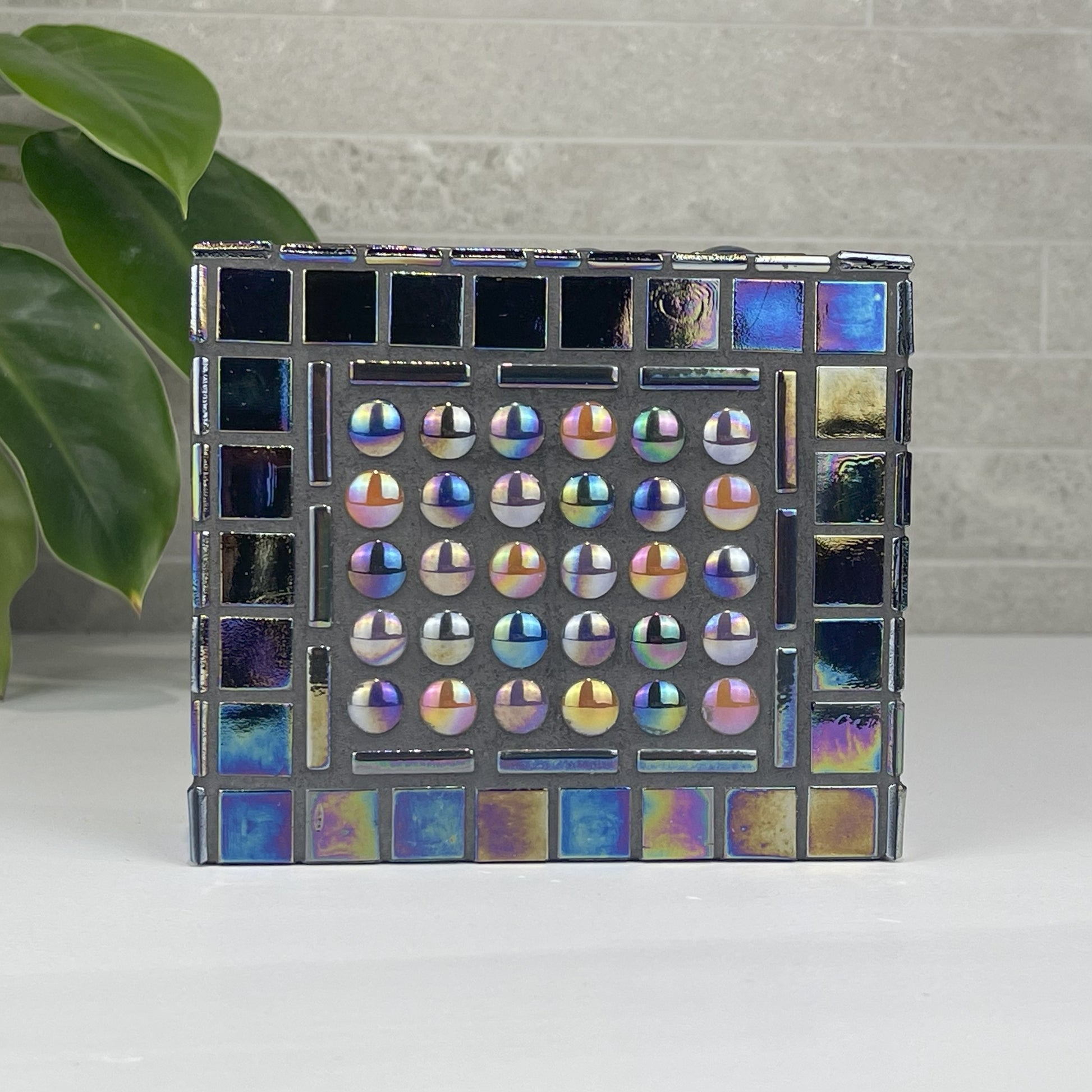 - Iridised burnt orange, black, purple and dark blue circular glass tiles